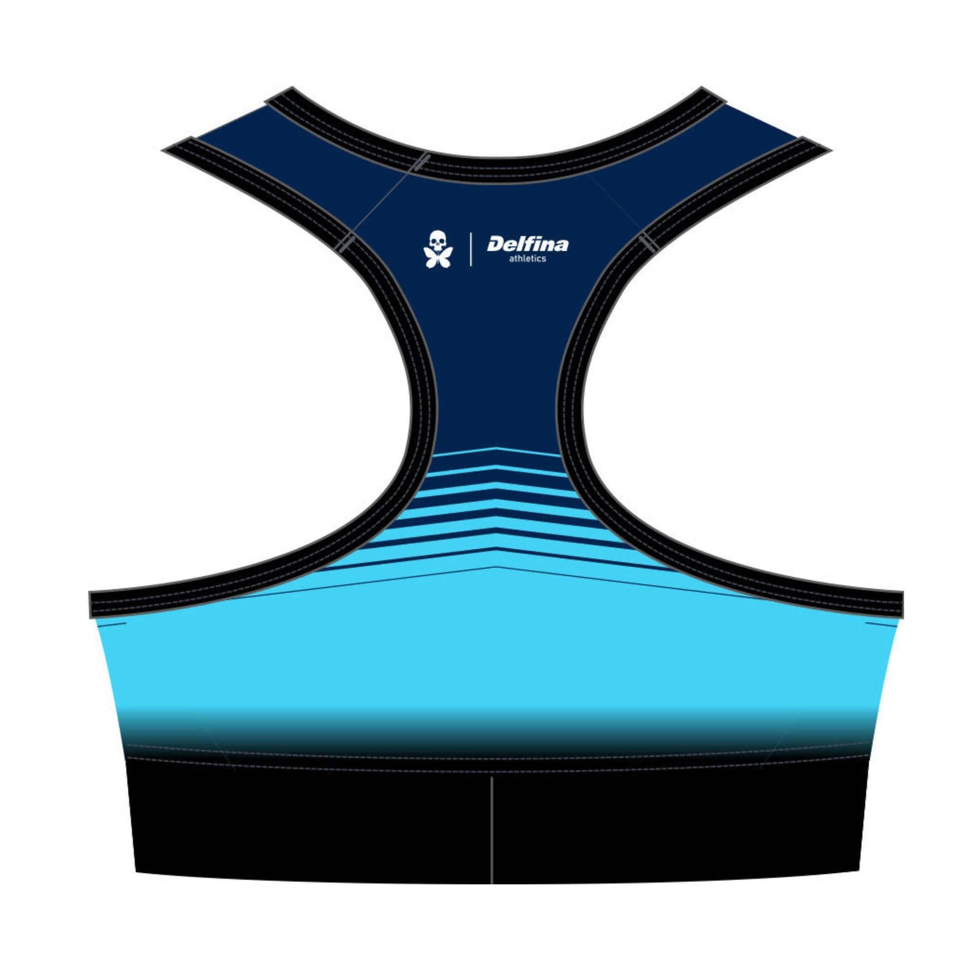 The Delfina Athletics x Betty Designs custom sports bra is perfect to wear under your cycle jerseys, tri tops, tri suits, and skinsuits, or wear alone for running, yoga, gym workouts, and more. The slightly higher cut neckline gives a flattering look and additional sun protection.